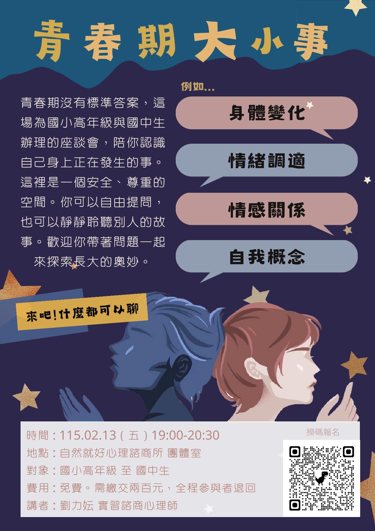 陪伴青春期的探索與挑戰。在理解與尊重中,協助青少年面對課業、人際、情緒與自我認同。