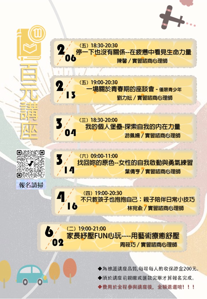 自然就好提供許多豐富的講座與團體課程,涵蓋多元主題的百元講座、兒童/青少年專屬的團體課程、自我探索成長團體,以及心理專業成長培訓課程…等,歡迎您一起來探尋內心的寶藏/學習專業的能力。