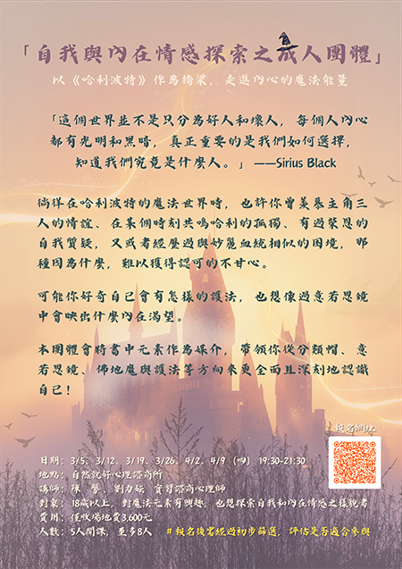 報名方式: 1.點選頁面下方【立即報名】填寫表單 2.加入Line:@rhc2222c留言告知姓名與想參加之課程 3.來電自然就好心理諮商所06-2...