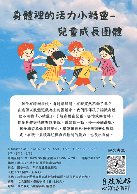 報名方式: 1.點選頁面下方【立即報名】填寫表單 2.加入Line:@rhc2222c留言告知姓名與想參加之課程 3.來電自然就好心理諮商所06-27528...
